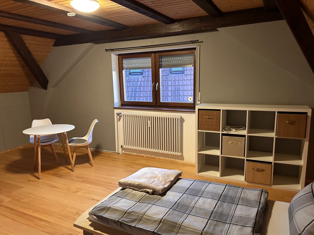 Unsere zweite Wohnung erstreckt sich über das erste Obergeschoss und das Dachgeschoss und bietet Platz für bis zu sechs Personen. Sie verfügt über zwei Badezimmer, eine separate Toilette, eine Küche, vier Schlafzimmer und einen Wohnbereich. Der Zugang erfolgt über eine Außentreppe im Innenhof.